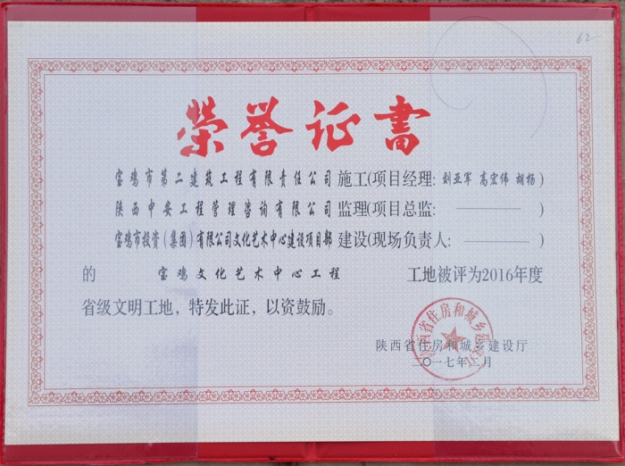 2017年度省級(jí)文明工地(寶雞文化藝術(shù)中心)