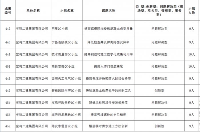 近日,從陜西省建筑業(yè)協(xié)會(huì)獲悉,在“2022年陜西省工程建設(shè)質(zhì)量管理小組競(jìng)賽活動(dòng)”中,集團(tuán)公司17項(xiàng)成果從2119個(gè)成果中脫穎而出,一次性獲得一類成果9項(xiàng),二類成果4項(xiàng),三類成果4項(xiàng)。其中技術(shù)質(zhì)量部QC小組的《提高鋼結(jié)構(gòu)施工數(shù)字化成果利用率》和碧水潤(rùn)園QC小組的《研制一種控制混凝土板厚的裝置》被推薦參加國(guó)家QC小組成果發(fā)布。集團(tuán)公司榮獲“2022年陜西省質(zhì)量管理小組活動(dòng)先進(jìn)企業(yè)”稱號(hào),并連續(xù)八年獲此殊榮。