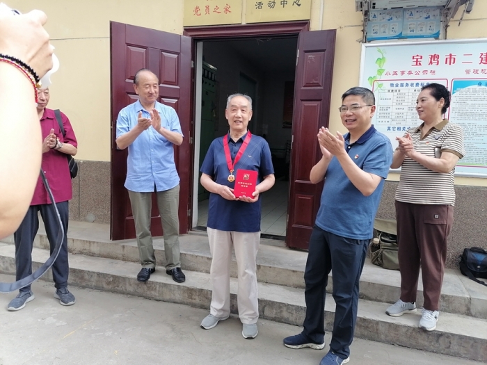 黨委副書(shū)記沈?yàn)槊駷橥诵蔹h員王體澤同志頒發(fā)“光榮在黨50年”紀(jì)念章。